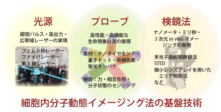 ![]() 生体運動を司る分子モーターの直接計測や細胞膜上の受容体の可視化など、日本は世界に先けて水溶液中における生きたタンパク質の1分子可視化・計測技術を発展させてきた。 このユニークな技術をさらに発展させ、細胞内情報伝達系や組織・器官など生体システムがダイナミックに機能している場における分子の時空間的な動態の計測を可能にする「細胞内分子動態イメージング法」の開発を進める。このためには、以下を実現する必要がある。 • 細胞内でのナノメータ空間分解能およびミリ秒時間分解能の実現 • 生きた細胞・組織内での分子の3次元分布・動態計測 • 広帯域マルチカラーイメージングによる多種分子間相互作用の同時計測 このような計測により、細胞内での遺伝子発現の可視化 、刺激に反応している細胞の膜上における 受容体分子の時空間分布や細胞骨格・細胞の極性の時間変化、興奮時の膜電位・静電相互作用、 免疫反応などの高次生体反応を定量的に計測できると期待される。 これらを実現するため、要素技術として光源・検鏡法・プローブについて集中的に開発する。 |