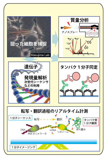 ![]() 最先端計測技術と、組織内の特定の細胞1個を捕捉・操作する技術とを融合することにより、細胞に刺激を加えた後の動態変化の瞬間の細胞内成分を網羅的に分析することが可能になる。 例えば、ナノスプレー技術を用いた1細胞質量分析法により、細胞顆粒内の様々な代謝物も含めた生合成の様子が、短時間でモニター可能となっている。また、抗体によるより感度の高いタンパク質同定、次世代シーケンサによる 遺伝子発現量の計測においても、1細胞レベルでの計測は実現可能である。 これらと前述の一分子動態計測などの組み合わせにより、関係分子群の質や量の変化・動きを同時に追跡し、細胞活動全体の把握を目指す。さらに、生きた細胞あるいは再構成系での動態計測の実現に向け、転写過程におけるmRNA 分子の動態やタンパク質の発現過程をリアルタイムで連続観察することにより、 mRNA の1分子単位での塩基配列計測や、タンパク質-タンパク質・リガンド相互作用過程の追跡を可能にすることを目指す。 |
